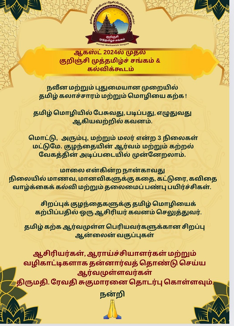 One teacher will focus on teaching Tamil language and culture to special children. Special online classes for adults interested in learning Tamil. Enrollment in Kurinji Academy is not mandatory for Kurinji Muthamizh Sangam members, students from other Tamil schools are welcome to be part of our Sangam and partake in our events open for members.